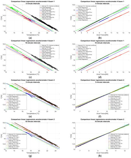 Beam 2 is sound in each dataset; therefore, no frequency variation should be appreciated between the 72 h benchmark and the 12 h datasets. When the correction is carried out by using axial force (Table 4 and Table 5), the absolute maximum frequency variation between the different datasets is smaller than 0.5%; this result is in line with what expected, since Beam 2 remains in nominal conditions in each dataset. When the correction is carried out using ambient temperature (Table 6 and Table 7), wider spreads can be observed, up to 2.5%.