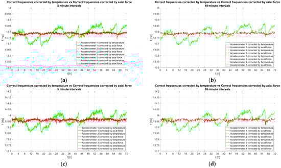 When the correction is performed using ambient temperature, the frequency variation is −0.6% ÷ +0.5% on the sound beam (Table 6 and Table 7) and −3.3% ÷ −4.4% on the damaged beam (Table 10 and Table 11). Therefore, it can be estimated that the frequency variation of the first mode, visible after temperature compensation, is −2.7% ÷ −4.9% (less accurate than −3.6% ÷ −4.1% estimated with axial force compensation).