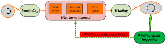 As the basic equipment of power transmission and transformation in the electric power industry, transformers are widely used in power plants, converter stations, substations, and customer sides, and occupy a very important position in the electric power industry [1,2]. Usually, transmission and distribution transformers are mainly composed of high and low-voltage coils, magnetic cores, insulation parts, and equipment protection parts; the high-voltage coils are made of polyester-enameled copper wire through winding machines [3], and the main workflow of the current production coils is shown in Figure 1.