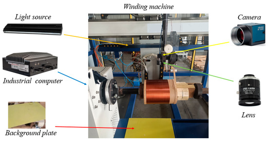 Due to the complexity of the production site environment, image acquisition is not easy to achieve [21]. To solve this problem, an image acquisition system was designed based on the existing winding machine. Figure 2 shows a picture of the site, which includes an industrial area camera, a high-resolution lens, a light source, a background plate, and an adjustable fixing device.