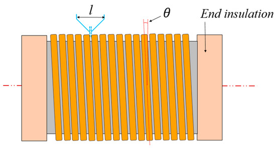 The goal of this paper is to achieve automatic measurement of winding angle and wire spacing of transformer high-voltage primary coils, with specific detection targets of l and θ as indicated in Figure 4. The wires are wound in the slot formed by the end insulation so that there will be a tilt angle θ in the direction parallel to the edge of the coil, and the fluctuation range of θ needs to be limited during production. The general value of θ will be small and can be approximated as cos θ ≈ 1, according to the Pythagorean theorem, and l can be considered as the distance between adjacent wires in the direction of the central axis of the coil, which also needs to be controlled to be within the limited range.