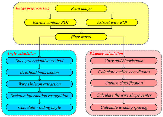 The design flow of the method to detect the above two specific parameters is shown in Figure 5. The yellow part is the pre-processing segment of the image, including the division of the image ROI and image filtering and denoising. The blue part is the winding angle detection segment, and an optimized gray level equalization method is proposed, which can solve the problem of an excessive span of the gray level of images caused by illumination. The pink part is the wire spacing detection segment, which uses the intersection of the perpendicular of the wire edge curve to determine the actual position of the wire, and then calculates the wire spacing.