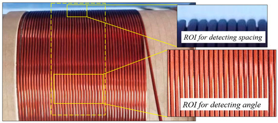 Machine vision technology is the emerging contactless measurement technology after optical inspection technology, with a very wide range of application prospects [11,12]. For high-speed automated production lines, the use of visual detection methods can effectively avoid missed or error judgments [13]. In recent years, many scholars have conducted various research in the related industries of transformer manufacturing. Reference [14] used machine vision to realize the correction process of coil wire winding position defects. By analyzing the landing position of each turn of wire, the control system coordinates the traverse movement of the wire arrangement motor to correct the current point, but the scope of application of the algorithm is not well described; Reference [15] uses the defective frame method and boundary tracking method to realize real-time detection and feedback of the surface quality of the enameled wire; Reference [16] establishes a wire jitter model, the cubic spline interpolation operation is used to eliminate micro-vibration, and the calculation of the wire diameter of the enameled wire is completed online; Reference [17] establishes the standard deviation function of the adjacent distance between the coil wires, if the coils are arranged neatly, the distance between adjacent wires is basically the same, and the standard deviation is small; otherwise, the standard deviation will be large, indicating that the coil is highly cluttered, and the data changes can be used to determine whether the coil is qualified or not; reference [18] proposed a method for identifying defects in the wire electroplating process based on machine vision, using the HSV model to set the defect threshold, distinguish whether there is a defect or not, and using the algorithm of image segmentation to eliminate the interference of the bearing around the wire. In other similar fields, reference [19] proposes a rotating grayscale projection method, which obtains the grayscale edge image of the braided composite preform based on phase consistency and non-maximum suppression, and automatic measurement of surface weaving angle and pitch length is completed through gray image rotation projection and block segmentation; Reference [20] proposes a method that uses the 2D-DFT(two-dimensional discrete Fourier transform) to transform the image of a woven fiber into the frequency domain and achieves the measurement of the fiber weave angle using the rotational invariance of the phase. Through a thorough analysis of the above literature, the proposed various testing methods do not apply to the parameter testing of the coils in this paper. One reason is that the surface reflection of the wires used in this paper is serious and the pretreatment is more complicated; another reason is that these methods do not show better advantages for the detection of winding angle and spacing of coils.
