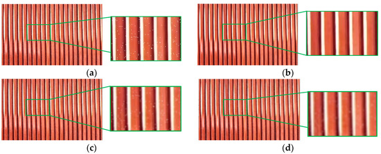 After the ROI image is acquired, there is salt-and-pepper noise in the image, and a filtering algorithm is used to smooth the noise. In this paper, after using mean filtering, median filtering, and Gaussian filtering [25,26,27], the median filtering was found to have the best effect on image detail retention and relatively short processing time among the results; because the median filtering will sort the data according to the data, the uncontaminated pixel points will be replaced as pretzel noise points, so the suppression is good [28]. A comparison of the details of the median filtering process is shown in Figure 7, and the median filtering was finally determined as the method used for the filtering session.