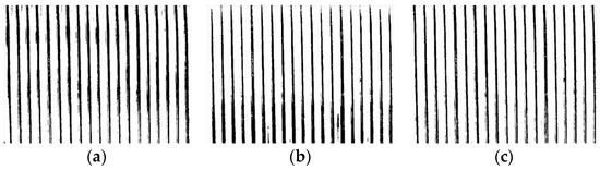 For the reason that there are more dark pixels in the image, 1/2 of the average gray value is taken as the segmentation threshold after the sample test to better distinguish the wires from the gaps. Each figure in Figure 10 is: (a) adaptive binarization, (b) the original image is obtained as a binarized image based on the above threshold, and (c) the slice method grayscale image is based on the binarized image obtained from the above threshold, respectively. From Figure 10, we can see that the image obtained by the slicing method is more evenly distributed, even though there is still some noise interference, but it does not affect the overall recognition effect, and the binarization noise can be eliminated by using the image opening operation.