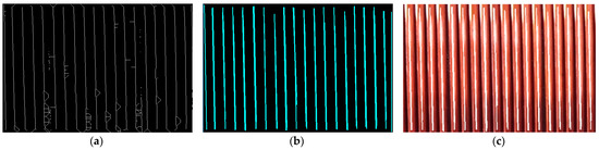 As shown in Figure 11a, these white pixel dots obtained after skeleton extraction are the skeleton of the wire. As shown in Figure 11b, using the Hoff straight line detection algorithm [32] for feature straight line identification on the skeleton image, the endpoint coordinates of the feature straight line can be obtained, and with these endpoint coordinates, the slope of the wire segment can be calculated, which can then be converted into a winding angle by trigonometric transformation. Figure 11c shows the comparison between the feature straight line and the original image. It should be noted that if the recognition angle is 90 degrees, the calculated slope will be infinite, so when this occurs, the 90-degree winding angle is output.