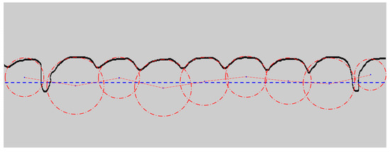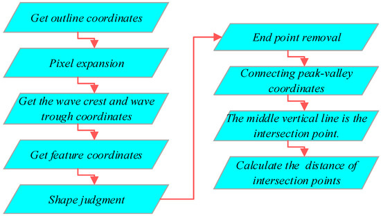 - Obtain spacing information. After judging the image, start the order from step 4, as shown in Figure 19; this is an ideal M-type contour, and every adjacent mid-pipeline will intersect to form several blue coordinate points.