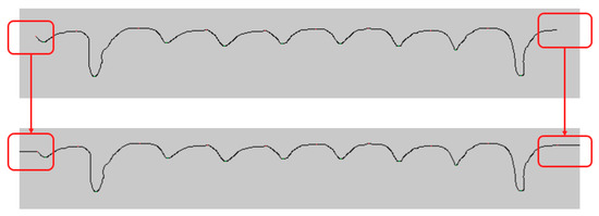 - Shape judgment. The contour lines of ROI images usually do not start and end at a certain peak or trough, but mostly start somewhere between the peak and the trough, so that two false peak and trough coordinates will be obtained in the previous calculation step, such as (x2, y2) and (xn, yn) points in Figure 18a, and the existence of these two pseudo points will affect the calculation results at the end. The method to eliminate these two points is by judging the size of x1 and x2, if x1 > x2, the image is considered to start from the wave peak and delete (x2, y2); if x1 < x2, the image is considered to start from the wave trough and delete (x1, y1); the same for the tail processing, so that the combination of two will form four types, which are defined as “W-type” and “M-type”, “N-type”, and “inv-N-type”, and according to the distribution form of these points, the subsequent calculation requires the corresponding type of separate calculation results.