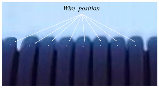 In the wire spacing experiment, the coil-to-lens distance is set to 550 mm, according to Equation (7); the distance conversion ratio k is 0.09 (mm/pixel), and the ROI image size of the outline part is set to 320 × 230 pixels. In addition, this method uses the edge profile curve of the wire, in Figure 3, the edge profile of the wire increases in the direction perpendicular to the camera view; the changing distance is negligible compared with the distance from the winding to the camera, so the value of k represented by each layer of the wire is considered constant.