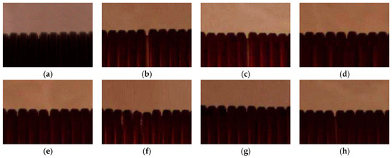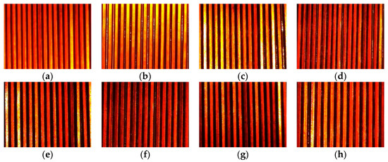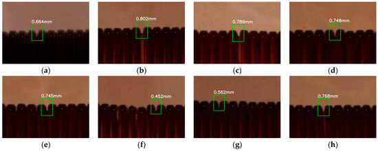 Before starting the experiment, the relative angle between the camera and the axis is adjusted so that the camera is horizontal to the radial direction of the axis when taking images, the camera object distance is set to 550 mm, and the light source brightness is set to 347 lux. Eight coil images were dynamically captured during machine production, and the ROI was set to 640 × 480 pixels, where (a–d) is the ROI when the wire with a 2.4 mm wire diameter is wound, and (e–h) is the ROI when the wire with a 2.6 mm wire diameter is wound. The pre-processed images are shown in Figure 21, and the detection results of each ROI are shown in Figure 22.