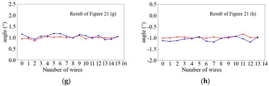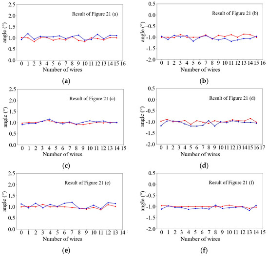 In each image of Figure 22, the horizontal coordinates represent the number of valid wires detected from left to right in the ROI, and the vertical coordinates represent the angle range. Since the coils are wound back and forth from the wire layout device, the winding angles formed by the adjacent layers are relative. The red dots are the angles detected by the proposed method, and the blue dots are the angles measured by our electronic digital display angle scale. From the results in each figure, the maximum difference between the two methods is 0.3°, which is within our allowable error, and with a fixed amount of feed per wire turn in actual production, this winding angle has a small range of variation, so the final results are all around plus or minus 1°. However, there are fluctuations in the individual results, and some of the wire numbers do not match the actual conditions. The reason for these errors is that during the winding process, the uneven wire surface and some gums in the gaps produce light reflection, which affects the accuracy of the skeleton identification, which in turn leads to the deviation of the identified individual features from the straight line, but did not affect the overall result analysis, and the usability of the identification winding angle method was proved after doing a full comparison.