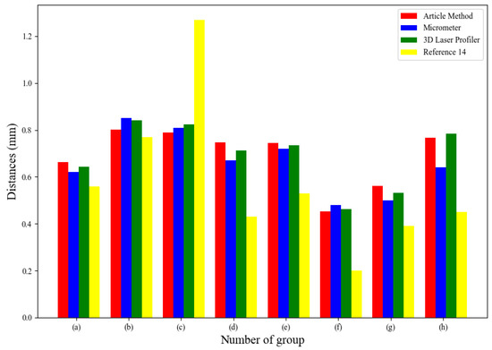 From the data obtained in Table 1 and Figure 25, it can be seen that, first, the least squares fitting method proposed in the literature12 does not apply to this study, and the difference between group 3 experiments and the laser profiler reaches 0.4 mm, and the average difference of the other groups also reaches 0.3 mm. Second, when the micrometer measurement results were compared with those of the laser profiler, only the difference between group 1 and group 8 exceeded 0.04 mm; the other groups did not differ much, but the use of a micrometer requires more inspection time, which is not conducive to enhancing the automation of the production process. Finally, compared with the measurement results obtained by the spacing detection algorithm of the paper and the laser profiler, the difference is only about 0.04 mm for the other groups except for the first group, where the difference is more than 0.1 mm, but the cost of using the laser profiler is 10 times more than the detection equipment in this paper. Therefore, the experimental comparison proves that the detection method in this paper has the value of a practical application.