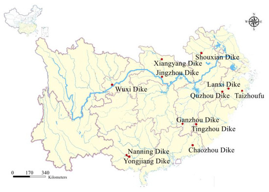 The urbanization process in China has had a great impact on the urban water system structure. The cross integration of the urban flood control pattern optimization and historical water project protection based on flood control safety and landscape ecology is gradually becoming a research hotspot [1]. There are many ancient water conservancy projects in southern China, including ancient flood control levees, ancient weirs and dams, and ancient irrigation areas, which are mainly distributed in the tributaries of rivers in southern China. Historic water projects should be protected and restored from the perspective of increasing the water security elasticity of urban areas, improving the living environment, increasing biodiversity and other urban ecological comprehensive effects [2]. Historically, ancient riverbanks had the functions of flood control, navigation and military defense, such as those in Jingzhou in Hubei, Shouzhou in Anhui and Taizhou in Zhejiang [3,4,5,6]. Figure 1 shows the locations of representative ancient flood control dikes in southern China, which are distributed in cities and towns with relatively dense populations along rivers. The ancient riverbank and the old city form a whole, supporting the urban ecology, industry and space structure. With the increase in urbanization speed and scale in the south of China, on the one hand, the river section of the urban water network tends to be deep and narrow, which increases the water level difference inside and outside the riverbank; on the other hand, many ancient flood dikes have been damaged due to the space occupied by urban facilities. In view of the frequent piping, soil flow and other problems of ancient riverbanks, it is necessary to explore the seepage instability mechanism through in-depth theoretical analysis. In this paper, a numerical model of unsaturated soil parameter variation is proposed to study the seepage stability of bank slope soil, in order to obtain more practical results and provide a theoretical basis and methods for the repair of ancient riverbanks. The paper uses the Lanxi ancient riverbank as an example to illustrate the contents and methods of this study.