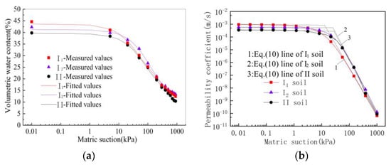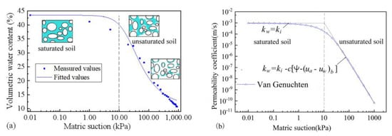 Firstly, the relationship between the volume moisture content and the matric suction was obtained using the pressure test of the ceramic plate. Then, using the linear fitting function “Newfunction” in Origin 2018, the fitting parameters of the models of the soil–water characteristic curve were obtained. Figure 2a shows that, with decreasing water content, the matric suction of the loess soil increased gradually. The lower the soil moisture content, the greater the increase in matric suction. The reason for this is that, with decreasing water content and less free water in the soil pores, water remains only in the smaller pores between the soil particles. At this time, the transmission of pore water pressure depends mainly on the water–air interface in the smaller pores, namely the shrink film. Smaller pores provide shrink films with a smaller radius of curvature, thereby allowing the shrink films to withstand larger pore air pressure and transmit smaller pore water pressure. Therefore, the difference between pore air pressure and pore water pressure is greater when the soil-water content is lower, and the lower the water content, the greater the matric suction of unsaturated soil. The relationship curve between the permeability coefficient of saturated-unsaturated soil and the matric suction, as calculated by Equation (6), is shown in Figure 2a.