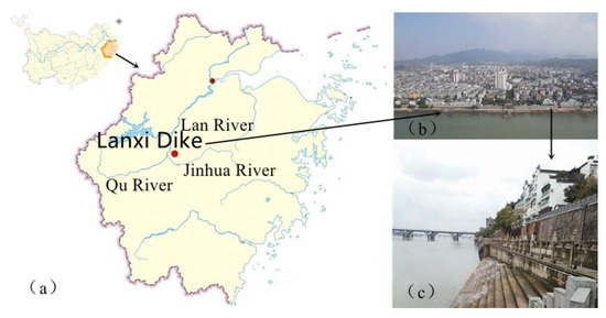 Geographical location and appearance of Lanxi ancient riverbank. (a) Geographical location; (b) overall view of Lanxi ancient flood bank; (c) local appearance of ancient flood bank.