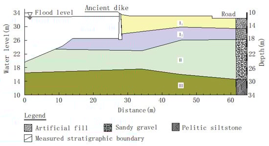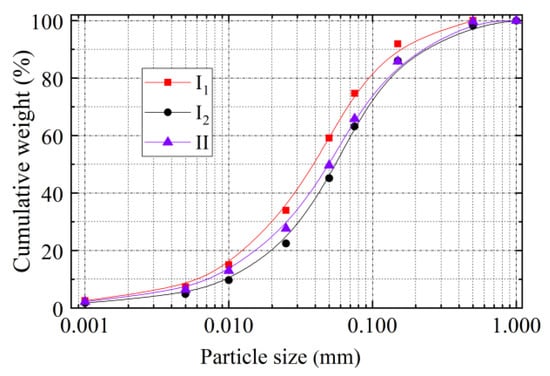 Artificial fill soil samples were taken along the section height at the ancient riverbank for soil test, and soil samples with a particle size of less than 2 mm for particle analysis were taken after screening. The grain grading curves of layers I and II soil samples less than 2 mm are shown in Figure 6. The mass of the soil samples in layers I and II with particle size greater than 0.075 mm should not exceed 50% of the total mass, the liquid limit was 44%, the plastic limit was 27%, the plastic index was 17, and the filling type was silty clay.