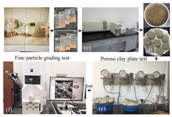 At the site of the ancient riverbank, soil samples Ⅰ1, Ⅰ2 and Ⅱ were taken along the depth for the soil property test. According to the standard for the geotechnical testing method (GB/T50123-2019), the engineering classification of soil was determined through the fine particle gradation analysis test. Then, the relationship between the volume moisture content, permeability coefficient and matric suction of the soil sample was obtained by using the porous clay plate test, which provides parameters for the finite element numerical analysis. At the same time, the microscopic images of soil samples were obtained by means of an electron microscope scanning test to analyze the structural changes of soil samples under the effect of matric suction. The test process is shown in Figure 5.