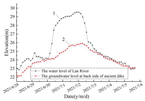 The average water level height of the Lanjiang River in winter is 23.14 m, and the water level of the Lanjiang River fluctuates sharply in rainy season. The typical flood fluctuation period and the corresponding hydrostatic pressure of the groundwater at the back side of the ancient dike were taken as the boundary conditions of the numerical model, as shown in Figure 9. The water level of Lanjiang River rose sharply from June 30, 2021, reached its highest point of 29.53 m at 6:00 on July 2, and dropped to 22.95 m at 18:00 on July 5, with a drop of 6.58 m, as shown in line 1 of Figure 9. The antiseepage wall is set behind the dike. The monitoring data shows that the peak value of the groundwater level behind the ancient dike decreases significantly, and its change with time is shown in line 2 of Figure 9.