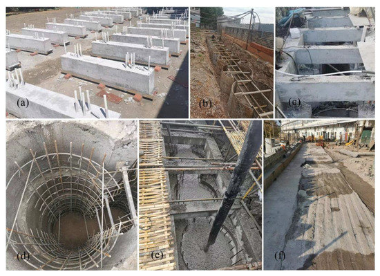 Process of setting antiseepage wall. (a) Precast beam; (b) well circle formwork; (c) locking beam; (d) reinforcement binding; (e) placing concrete; (f) complete.