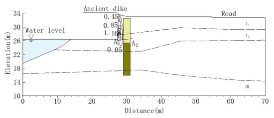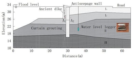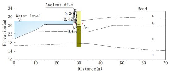 When establishing the numerical model, several oblique broken lines were used to simplify the slope surface of the ancient riverbank slope. The top elevation of the ancient riverbank is 33.05 m, the toe elevation is 26.88 m, the foundation elevation of the ancient dike is 24.80 m. The upper vertical section is 6.17 m high and 0.22 m wide at the top. The bottom of the upstream slope is 19.05 m high, and the slope gradient is 22° and 43°, respectively, from bottom to top. The ancient dike is close to the building, the building foundation is deep foundation, and the upper load directly acts on the bearing layer, so its effect on the ancient dike could be ignored. The antiseepage wall is composed of concrete wall and a cement grouting curtain. The curtain penetrates the sand gravel layer and reaches the pelitic siltstone. The numerical model adopts a quadrilateral finite element with a side length of 0.5 m and generates 7023 nodes and 2584 elements. The numerical model of the ancient dike with antiseepage wall is shown in Figure 11.