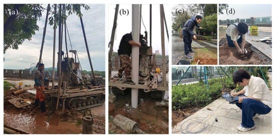Installation of water level logger and extraction of monitoring data: (a) drilling; (b) hole wall reinforcement; (c) put into the water level logger; (d) fixed position; (e) extract Data.