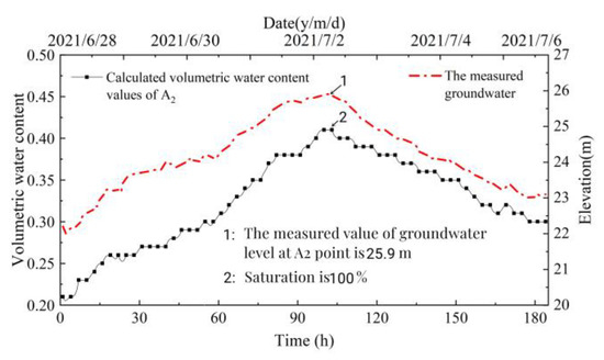 When the flood peak passes through, the water level of the Lanjiang River changes rapidly. The relationship between the permeability coefficient of the ancient riverbank and the pore water pressure follows the saturated-unsaturated seepage model. The groundwater level monitoring value of A2 pore and the volumetric water content result calculated by the numerical model during flood peak fluctuation are shown in Figure 13. When the groundwater level monitoring value of A2 point is 25.9 m higher than the elevation of the A2 point, the calculated volumetric water content of the A2 point reaches 0.41, that is, the A2 point saturation is 100%. When the groundwater level monitoring value of the A2 point is lower than 25.9 m, the volumetric water content of the A2 point will decrease accordingly. The numerical calculation results of the A2 point are in good agreement with the measured values of the groundwater level, which verifies that the numerical model parameters and boundary conditions are reasonable and the numerical model results are reliable.