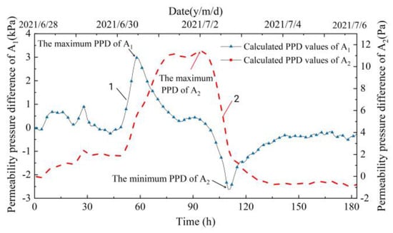 The transient water pressure difference was calculated using a saturated-unsaturated seepage model. The change curve of permeability pressure difference at points A1 and A2 under the transient water level after the antiseepage wall is shown in lines 1 and 2 of Figure 14, which is basically consistent with the results of finite element analysis. The transient change trend of the permeability pressure difference at the toe of the ancient dike was basically the same before and after the antiseepage wall was set, but the difference between the transient permeability pressure difference at A1 and A2 points on both sides of the antiseepage wall was large, about 2000 times. The maximum value of the permeability pressure difference at the A1 point is 3.17 kPa, the minimum value is −2.54 kPa, and the maximum permeability pressure difference at the A2 point is 11.68 Pa. The seepage prevention effect of the antiseepage wall is obvious, which greatly reduces the water pressure at the back side. The finite element numerical calculation results are consistent with the monitoring data.