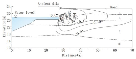 After the antiseepage wall was set, the hydraulic gradient distribution of the ancient riverbank has changed. Between the ancient dike and antiseepage wall, the hydraulic gradient contour is densely distributed, reaching the maximum value of 1.16 at the toe of the dike, as shown in Figure 17.