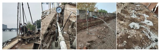 Modified lime grouting for filling of ancient riverbank. (a) Drill hole; (b) grouting pressure gauge; (c) modified lime grouting; (d) distribution of grouting holes.