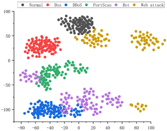 We find that benign data, DDoS, DoS, and Portscan data are each clustered together sizably and are distant from the other categories. However, some of the Bot and Web Attack data are also clustered together, but there are multiple cluster centers in the same class, and the distance between each cluster center in the same class is not close. The classification results of the subsequent experiments also show that these two data are closer to other classes of data, especially the Portscan. The reason for the above problem is that the training samples of Bot and Web Attack are small, and the number of training samples of these two attacks still cannot reach the average value due to the objective quantitative limitation.