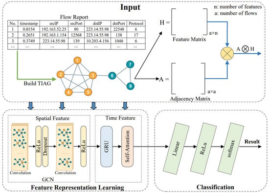 - Graph Convolution Network (GCN), which learns the graph’s structural information and node attributes while considering the correlation between nodes, enabling a more effective and comprehensive characterization of the nodes and the nodes connected to them [25]. The GCN uses the TIAG constructed in Section 3.2 to classify the data.