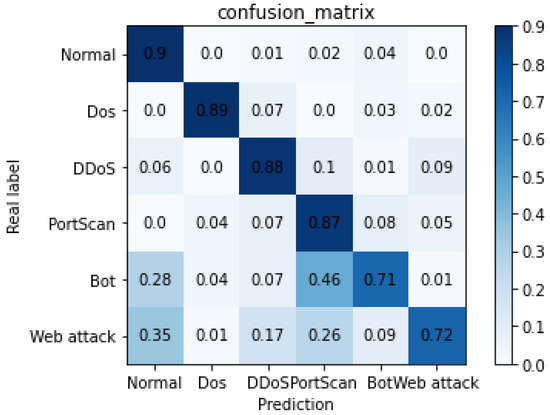 To understand the obfuscation relations among the five attack and normal data, we visualize the obfuscation matrix of G-TIAG, as shown in Figure 8. The recall of benign data is 0.9, and the recalls of the five attacks are 0.89, 0.88, 0.87, 0.71, and 0.72, respectively. The experiments show that G-TIAG can effectively distinguish benign data from the five attacks and the Dos, DDoS, and PortScan attacks from other categories of data. However, Bot and Web Attacks are more likely to be misclassified into PortScan and benign data.
