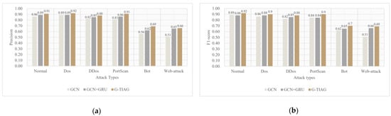 We find that the classification ability of G-TIAG for benign data and Dos, DDoS, and PortScan has been improved compared with the other two methods. For Bot and Web Attacks, the classification ability has been improved substantially compared with GCN, and the classification ability has been improved marginally compared with GCN-GRU. Therefore, we can conclude from the above work that the GRU component contributes more to the classification results than self-attention.