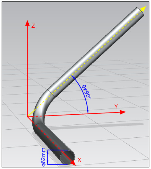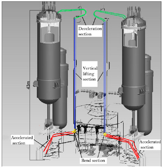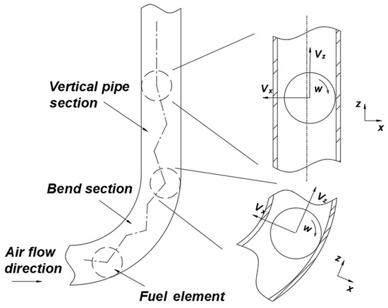 Asim et al. [20] studied the process of pipeline transport of fuel elements with water as the medium and explored the effect of each parameter of the element but did not carry out a kinetic study. German scholars studied the motion of fuel elements along the axial pipeline direction during the transport process [21,22,23] but did not take account of the complex motion behavior of highly coupled fuel elements (axial lateral shift of the vertical pipeline, collision, and friction with the pipeline wall, etc.), nor did they carry out experimental studies of the fuel-element operation process in the pipeline. Shen et al. [24] obtained the transverse coefficients Cd and Cy and the torque coefficient Cm of the fuel element based on CFD and established the equations of the motion of the fuel element accordingly. Liu et al. [25] performed a dynamic analysis of the motion process of the fuel element and derived the equations of the motion. Liu et al. [26] simulated the flow field using a structural mesh of fluid dynamics and performed a force analysis of the fuel element. However, previous studies focused on typical bends (pipe axis in the vertical plane) and did not consider atypical bends (pipe axis not in the vertical plane, as in Figure 2), which leads to a large error in the model calculation.