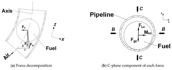 The pneumatic thrust on the fuel element in an atypical bend is in the plane where the bend axis is located, whereas , , and gravity can be decomposed into two components, namely, the parallel and vertical components of the bend axis plane, as shown in Figure 4. in Figure 4a refers to one of , , and . Plane B is the plane where the bend axis is located, plane C is the vertical plane of the bend axis plane, and and FC are the components of decomposed in planes B and C, respectively, where the z-axis is tangential to the bend axis in plane B and points along the airflow, the x-axis is in plane B along the bend radius and the direction is away from the bend center, and the y-axis is in plane C and perpendicular to plane B in the opposite direction of . Figure 4b shows the C-plane components of each force. , , and will result in translational and rotational motion of the fuel element in plane C.