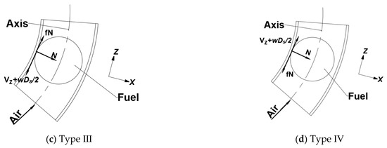 where , , and are the components of the x-axis, y-axis, and z-axis of the velocity of the fuel element after collision, respectively; and are the components of the rotational speed of the fuel element in surfaces B and C, respectively; and are the components of the average positive pressure of the collision process in surfaces B and C, respectively; and and are the components of the radius of the fuel element at the collision point in surfaces B and C, respectively. If the radius is infinite, Equations (1)–(13) define the kinetic model of the basic motion of the fuel element in a straight pipe.