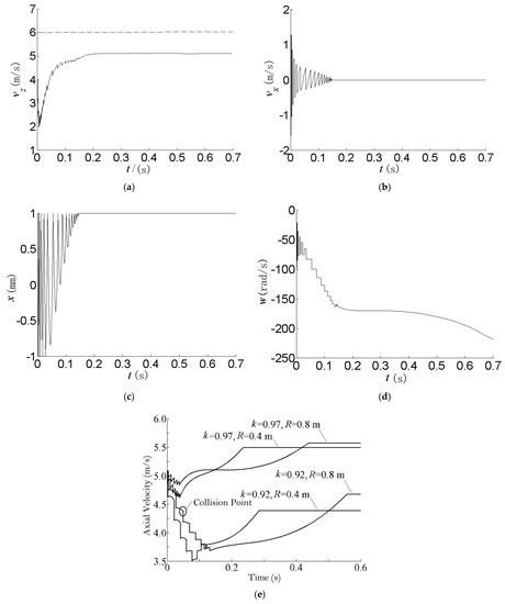 Figure 9a–d shows the curves of axial velocity , transverse velocity , transverse displacement x, and rotational angular velocity w of the fuel element in an atypical bend with time, respectively, and Figure 9e shows the effect of the sphere/pipe-diameter ratio and pipe-bending radius on the motion of the fuel element in the deceleration section.