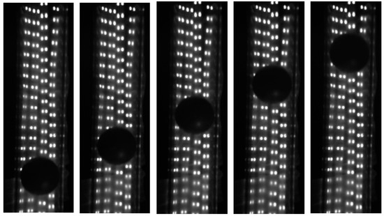 The roots fan is used to generate gas power. The gas flow is regulated by a regulating valve, which passes through a cooler, a thermometer, a pressure gauge, and a gas-flow meter before reaching the inlet of the dosing device. A 60 mm-diameter mock-up of the fuel element (colored Plexiglas sphere) passes through the dosing device into a 65 mm inner-diameter Plexiglas conveying duct and is driven by a continuous air flow to a collection device at a height of 15 m. The air density during the test was 1.2 kg/m3 and the gas-flow rate was 9.4 m/s. To measure the running speed of the simulated parts during the conveying process, a high-speed camera recorded the motion of the simulated parts and output a series of motion images, as shown in Figure 11.