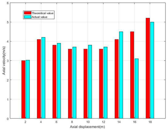 Figure 12 shows the comparison between the theoretical and experimental values of the axial velocity of the simulated parts during the whole conveying process, and each data point is the average velocity of the simulated parts at the corresponding motion distance. When the axial displacement of the simulated part was in the range of 0~14 m, the axial velocity calculated by the kinetic model of fuel-element lifting system was in good agreement with the experimental value, with a deviation within 7%. During the experiment, when the simulated part passed through the bend (axial displacement of 16 m), the velocity dropped significantly and the experimental value deviated from the theoretical value. The reason for the deviation may be that the diameter ratio of the ball/pipe in the bend section was less than 0.92, resulting in a significant reduction in the pneumatic thrust provided by the airflow. The phenomenon can be explained as follows: as the bend pipe installed on the test platform was made from a straight-pipe section with a 65 mm inner diameter by a hot-bending formation process, the inner diameter of the local pipe was larger than 65 mm during the manufacturing process.