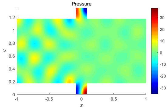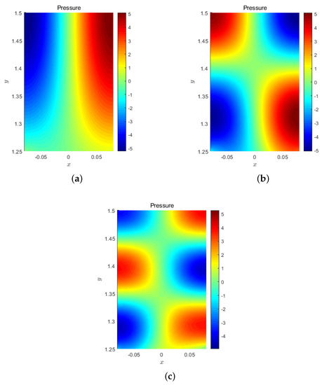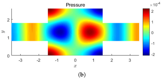 The proposed FEM-PML method associated with the aeroacoustic Galbrun equation in determining the resonance frequencies of the trapped mode was used. To ensure the convergence of the mesh, the size of was chosen. Various cavity lengths were selected in order to investigate its influence on the acoustic field under a trapped mode. For the calculation of the trapped mode, the cavity length was set from 1.0 to 2.8 with an interval of 1.8. The geometrical parameters of pressure, density, velocities, and angular frequency were normalized with duct height H, density , speed of sound , , and , respectively.