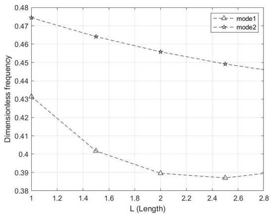 The evolution of the trapped-mode frequency with the length of the cavity at two different modes is illustrated in Figure 4. The x axis represents the length of the cavity, and the y axis is the normalized frequency of the trapped mode. The triangle is the first-order mode, and the star is the second-order mode.