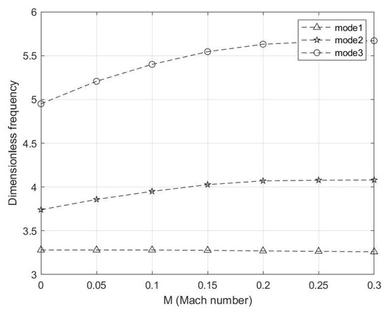 Figure 6 shows that, for the second and third modes, the trapped-mode frequency increased as the Mach number increased. However, the frequency of the first trapped mode did not change much with the increase in Mach number. When M = 0.1, the velocity of the fluid was relatively small, so the change in the vortex generated near the cavity had tiny influences on the frequency of the trapped modes. With the increase in Mach number, the frequency of the trapped mode changed greatly due to the vortex generated by the high-speed fluid.
