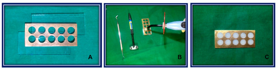 A total of sixty cylindrical specimens were prepared using a brass metal mold of dimension 70 × 30 × 2 mm containing 10 circular holes of 10 mm diameter. The composite material was syringed into the mold cavity in 2 × 1 mm thickness increments, followed by 20 s of intermittent LED light curing (Guilin Woodpecker Medical Instrument Co. Ltd., Guilin, Guangxi, China). The light intensity of this LED light-curing unit is 850–1000 mW/cm2 (as per user manual). During the curing step, a glass slide wrapped in a cellophane sheet was placed at the bottom and top of each mold to regulate the flow of material (Figure 2).
