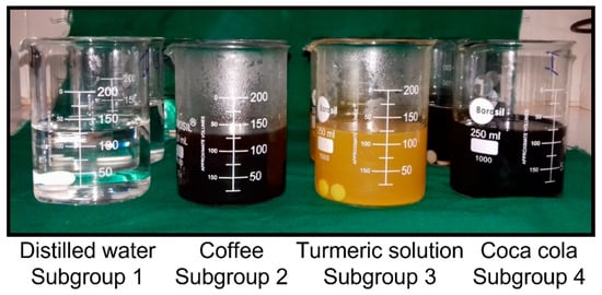 - Singh, S.V.; Aggarwal, P. Effect of Tea, coffee and Turmeric Solutions on the Colour of Denture Base Acrylic Resin—An In Vitro Study. J. Indian Prosthodont. Soc. 2012, 12, 149–153. [Google Scholar] [CrossRef] [PubMed]
