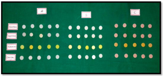 The greatest color change for group A specimens is seen in turmeric with ΔE = −28.70 (Scheme 1).