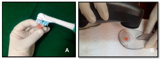 Before each measurement, samples were cleaned for 10 s with an electric toothbrush and toothpaste, gently rinsed in distilled water, and then dried with tissue paper (Figure 5A). The toothpaste used in this study was Colgate Total (Colgate Palmolive Ltd., Chharodi, India). According to ISO specification, a toothpaste should not exceed a relative dentin abrasiveness (RDA) value of 250, which is considered as a safe limit for hard tissues. Hence, the toothpaste used in the present study was Colgate Total, whose RDA value was 70.