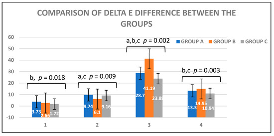 Comparison of ∆E difference between the groups. a- difference between A and B, b- difference between A and C, c- difference between B and C.