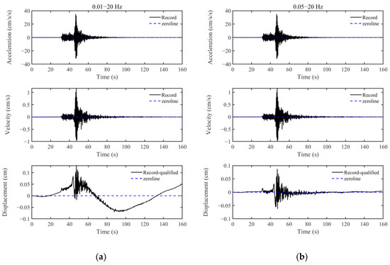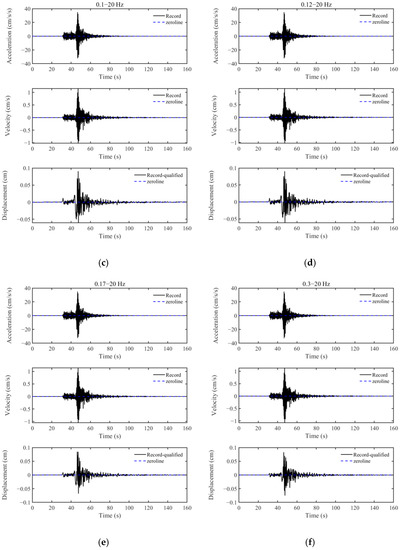 The partial acceleration, velocity, and displacement time series curves of record AKBAW--n.0212o88mof.BNE after filtering with different high-pass cut-off frequencies are shown in Figure 3. It was observed that the displacement time series curves obtained via filtering with the value before the accurate value as the cut-off frequency were all unqualified, and the ones after that were all qualified.