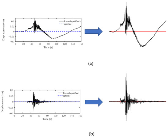 According to Xie [28] and Zhou [29], the low-pass cut-off frequency has little effect on the baseline offset of displacement time series for strong-motion records. The low-pass cut-off frequency in this paper is taken as 35 Hz (where the sampling frequency is 100 Hz) or 20 Hz (where the sampling frequency is 50 Hz). Generally, in the traditional method, people must subjectively inspect the acceptability of the filtering result by classifying the integral displacement time series curve into qualified or unqualified. However, there is no uniform classification standard in traditional artificial identification for the integral displacement time series qualification.