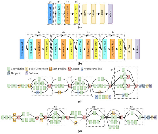 Architectures of typical deep neural networks. (a) VGG19; (b) ResNet50; (c) InceptionV3; (d) InceptionResNetV2.